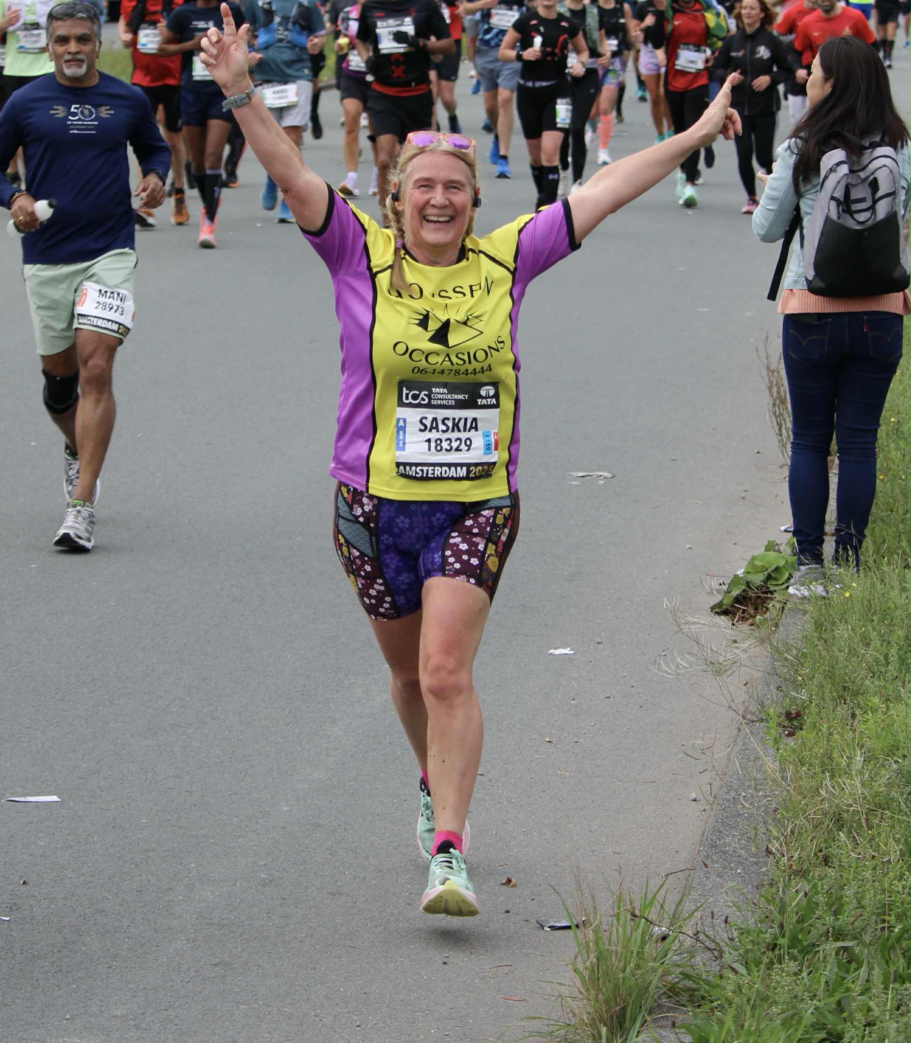 De 25 km die ik met horten en stoten haal. Ik heb een kleine pauze genomen na de helft maar mijn benen weigeren dienst dus ik moet veel wandelen. Afgelopen Rotterdam had ik iets soortgelijks maar toen had ik dit pas na de 25 km. Nu komt het iets eerder. Ik haal de 26 km dat het einde van de Amstel markeert. Het voelt een beetje als ‘klaar met Zuid’. Ik loop op 27 km langs Globalrunning als Marja me roept. Die staat foto’s te maken dus ik loop haar kant op en ze maakt een hele toffe foto! Hoppa, weer een paar meter afleiding. In elk geval op naar de 30 km waar het verval nu wel echt zichtbaar begint te worden. Liep ik de 25 km nog op 2:29, moet ik bij de 30 km al 5 minuten prijs geven op de 10 km per uur. Het geeft niet, alles onder de vijf uur is acceptabel en dat zou ik toch wel moeten kunnen halen. Tot mijn grote verrassing hoor ik Frank ineens roepen. Die is met de metro hier gekomen en ik geef hem een kus. Hij stuurt me weg met ‘alleen nog maar een rondje bos’.