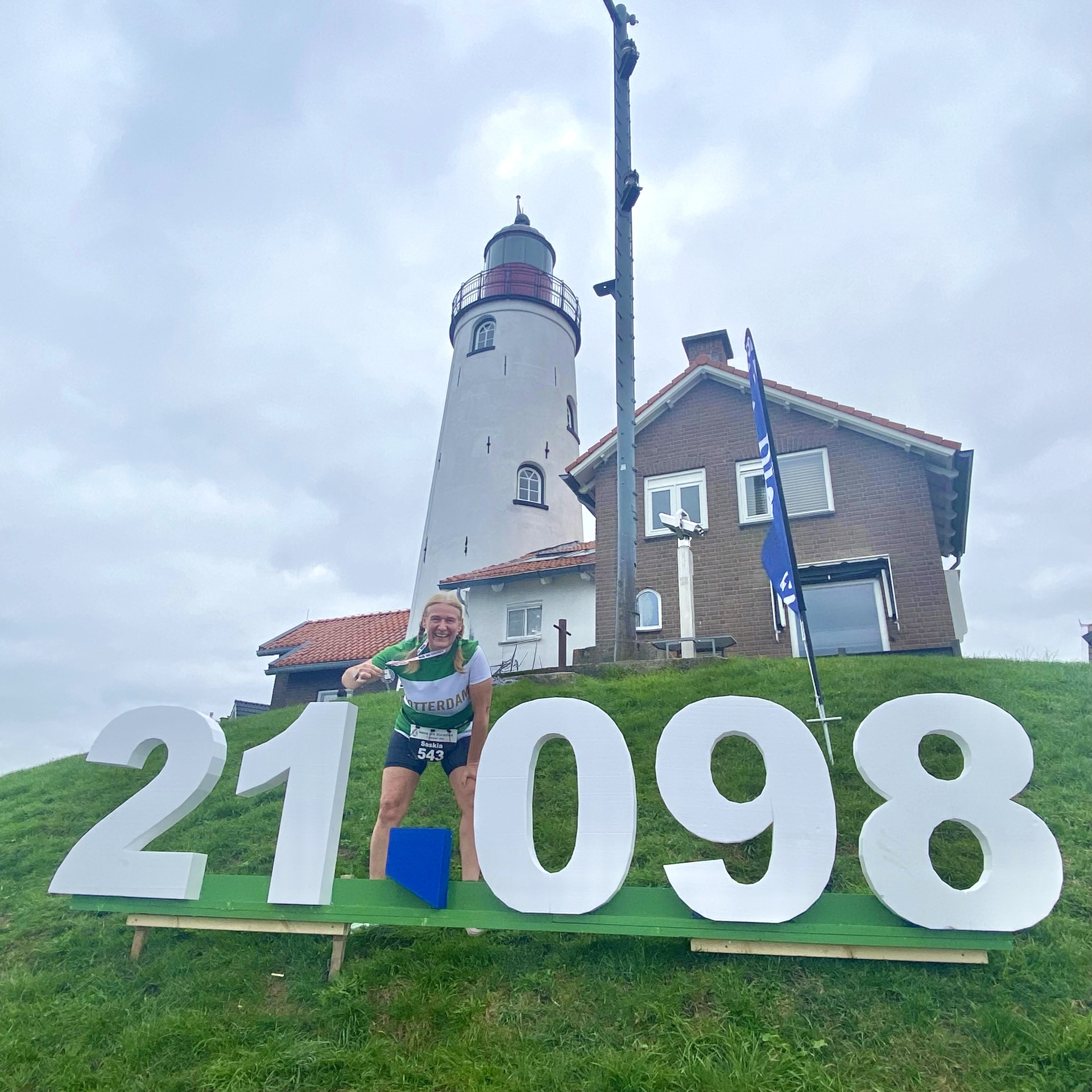 Ik finish in 2:05:36. Dat is nog steeds een mooie tien kilometer per uur en ik ben blij dat ik klaar ben. Ik krijg een mooie medaille maar we hebben het vooral over de persoon op de dijk. Deborah sluit aan en als we naar het foodplein lopen komen we Jacolien tegen. Die weet ons te vertellen dat de man in kwestie naar het ziekenhuis is. We kunnen alleen maar hopen dat het goed komt. We halen de tassen op maar eerst maak ik een foto met mijn medaille bij de piepschuim cijfers van de halve marathon en de vuurtoren. Daarna iets warms aantrekken en tijd voor lunch. Uiteraard wordt het vis. We eten een portie kibbeling alvorens we terug naar de auto gaan. Nog even langs Baarssen voor wat vis voor thuis en dan lekker naar huis voor een douche en een bank.